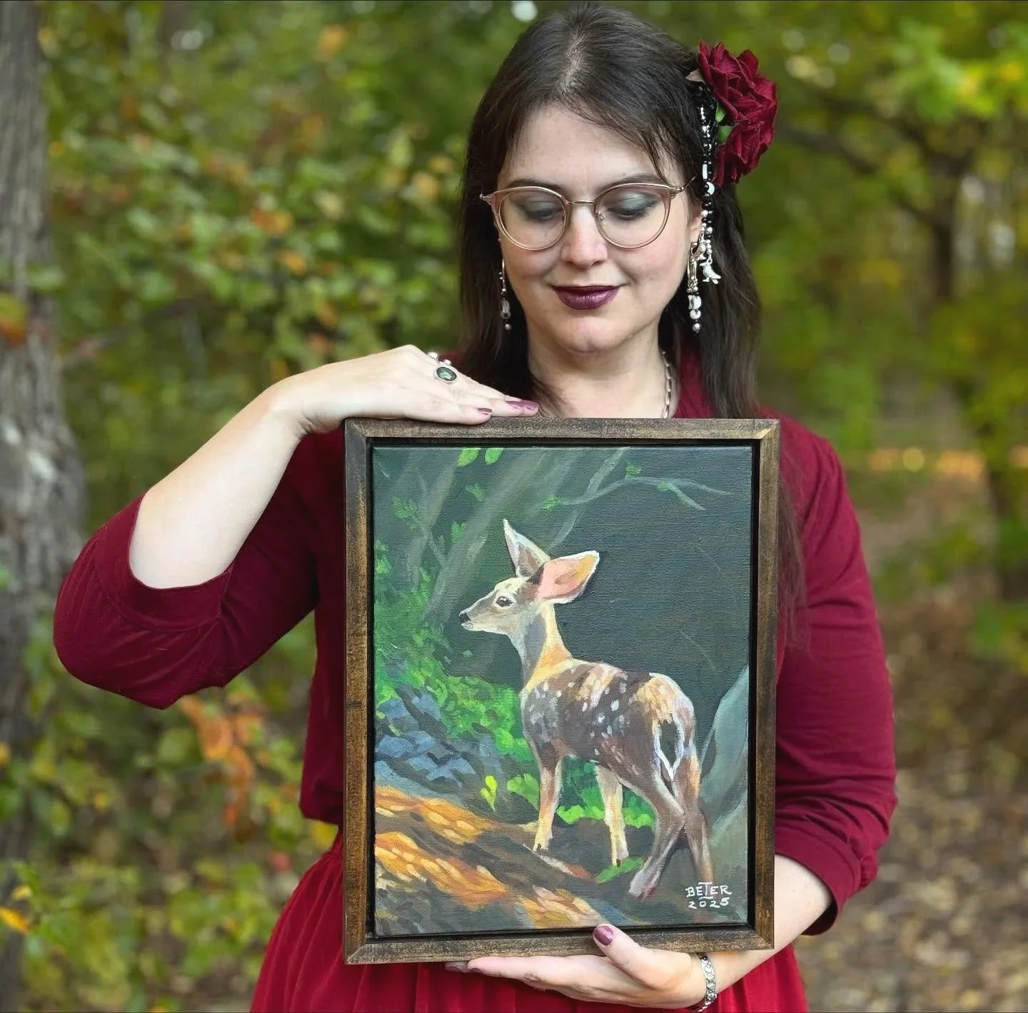The first part of my process is to go on a camping trip, road trip, or just a simple walk to feel connected with nature. I'm drawn to subjects both vast and tiny, from canyons to wildflowers. I love anything that changes in cycles, like phases of the moon or trees in different seasons. I paint these subjects with acrylic onto canvas with a signature feminine, undulating line. In addition to original paintings, I create oracle cards, greeting cards, posters, and prints. My work speaks to witches, nature lovers, and seekers. My paintings are a way to connect to my spirituality, my dad, and the existential joy of being alive on Earth.