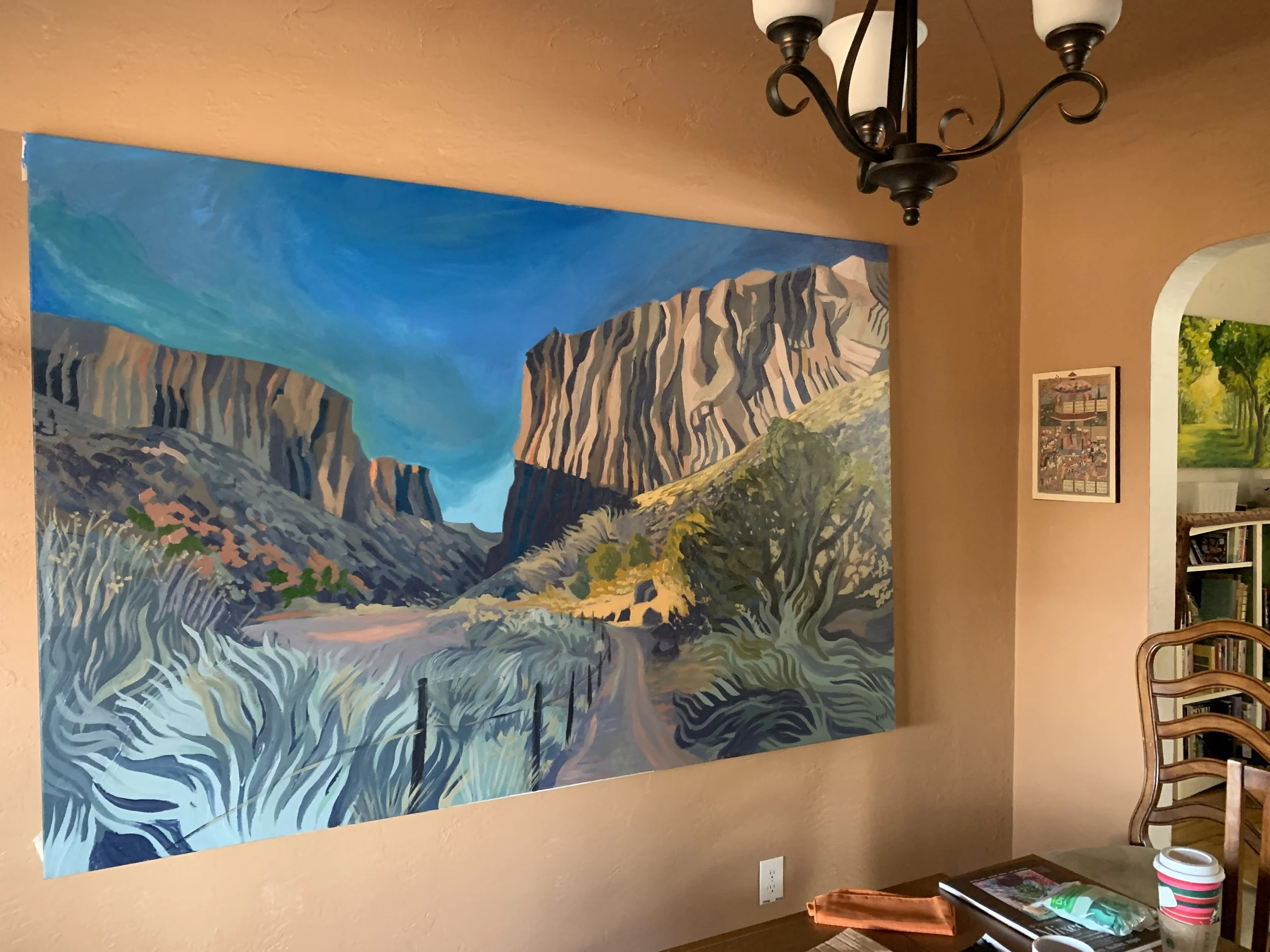 When I took in the view of White Rock Canyon the day after Thanksgiving, the thing I noticed the most was a bright blue light that seemed to come from the ground. I’m not sure what caused the light, but I was excited to capture it on canvas.