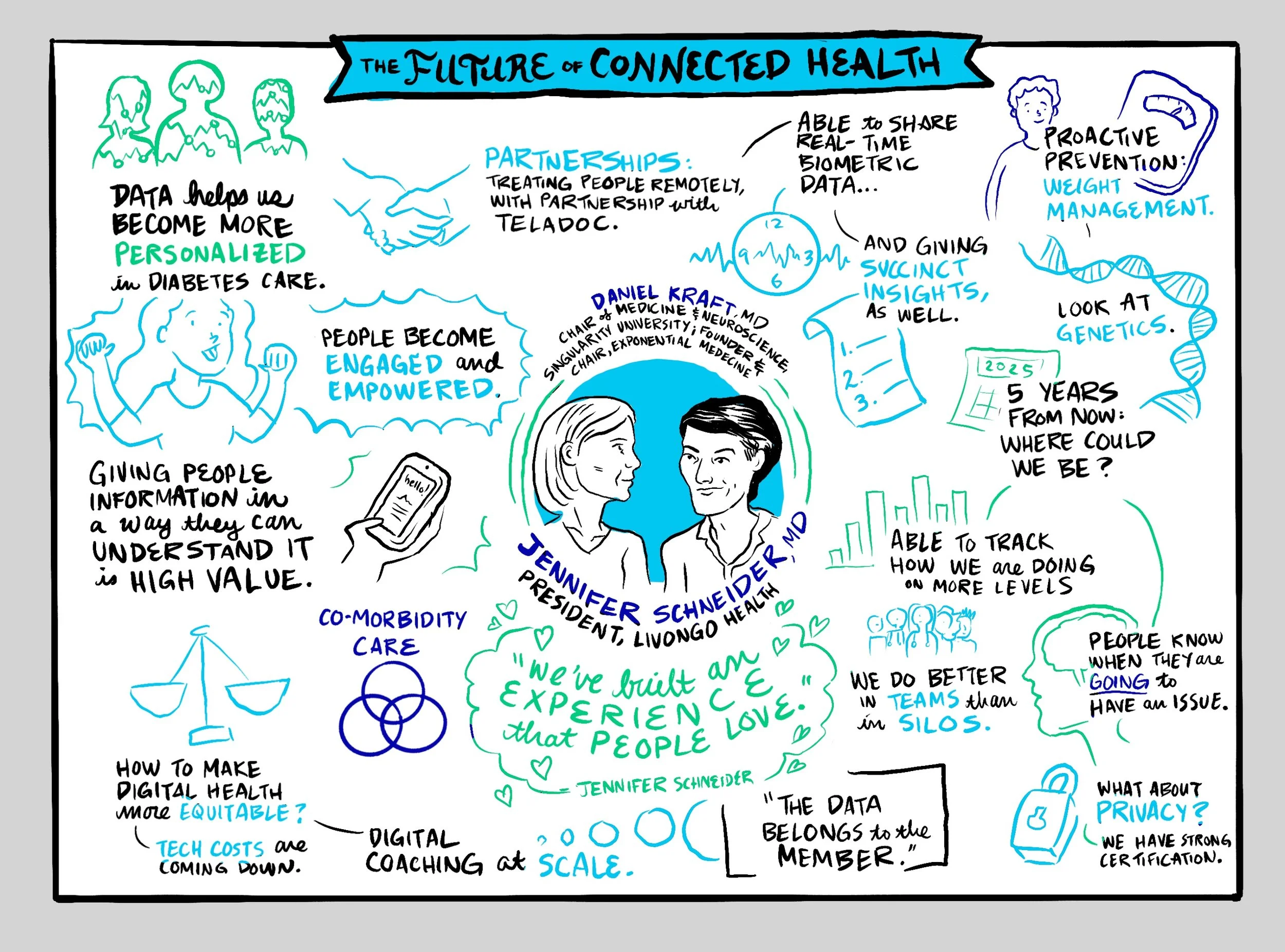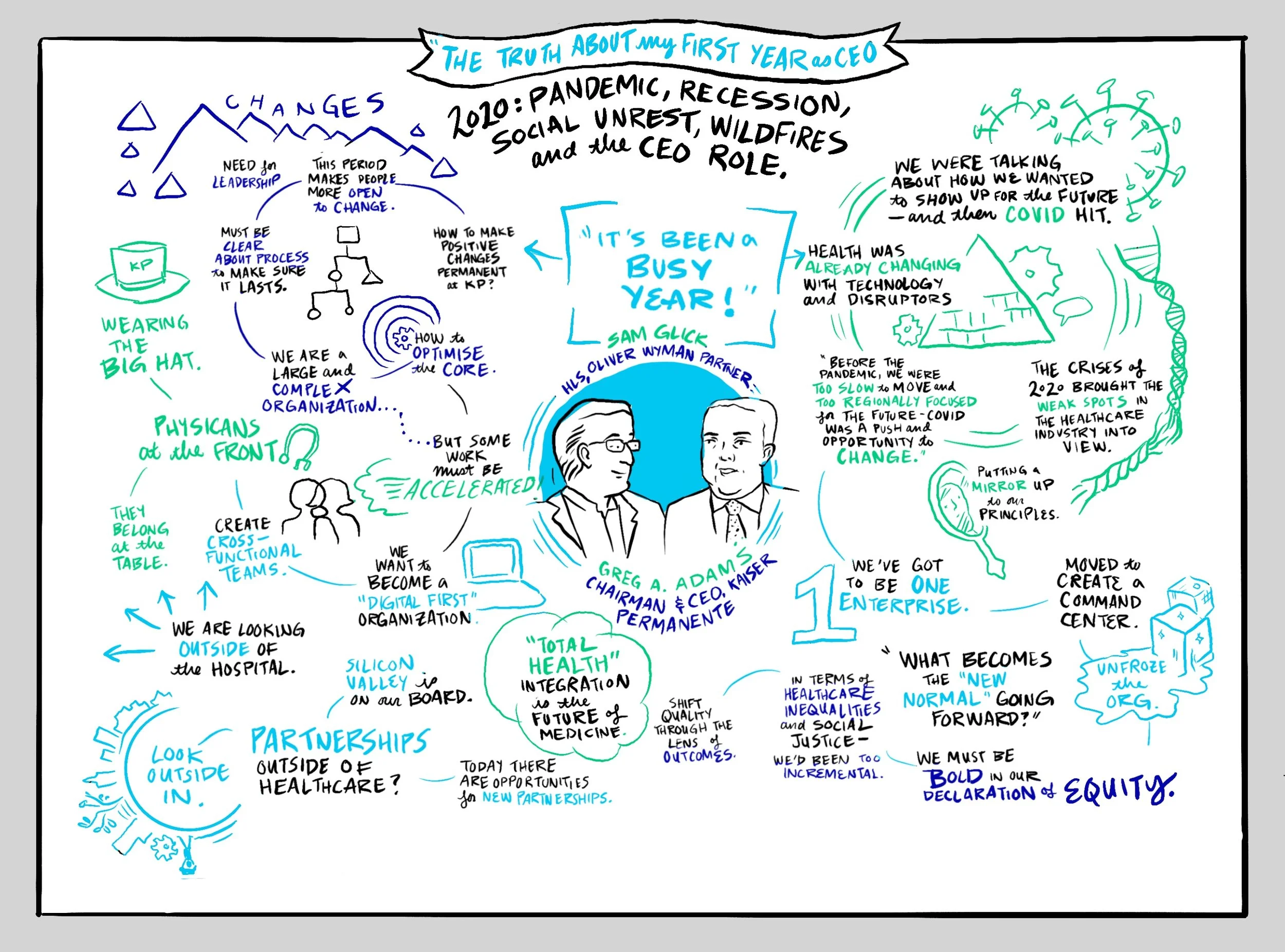 I created scribes to capture talks from the Oliver Wyman Health Innovation Summit in 2020, including a conversation with Kaiser Permanente’s CEO. These are reposted from OW’s public-facing sites.
